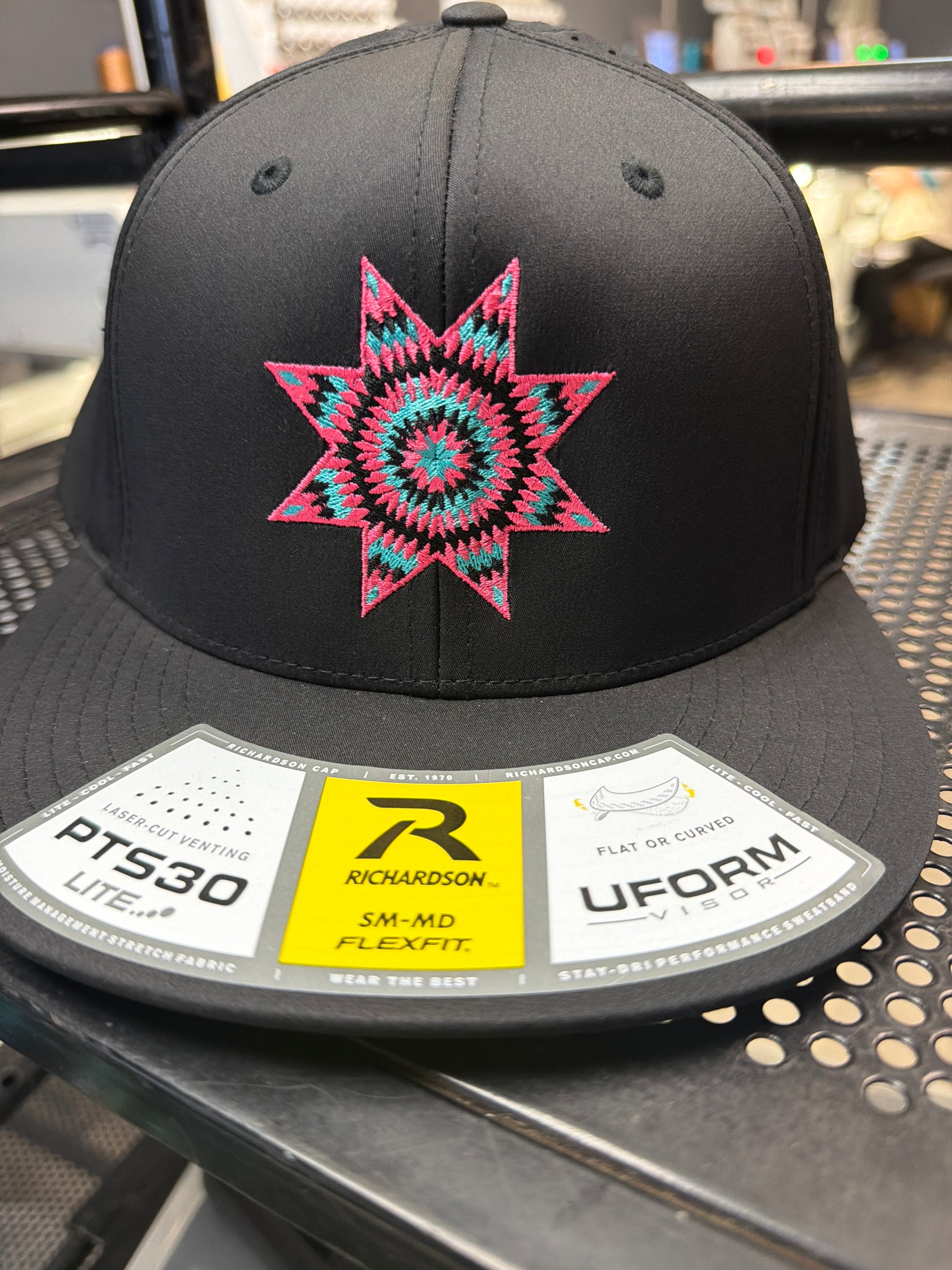 Black Richardson DTS630 Flexfit cap with breathable performance fabric and vibrant neon starburst embroidery.